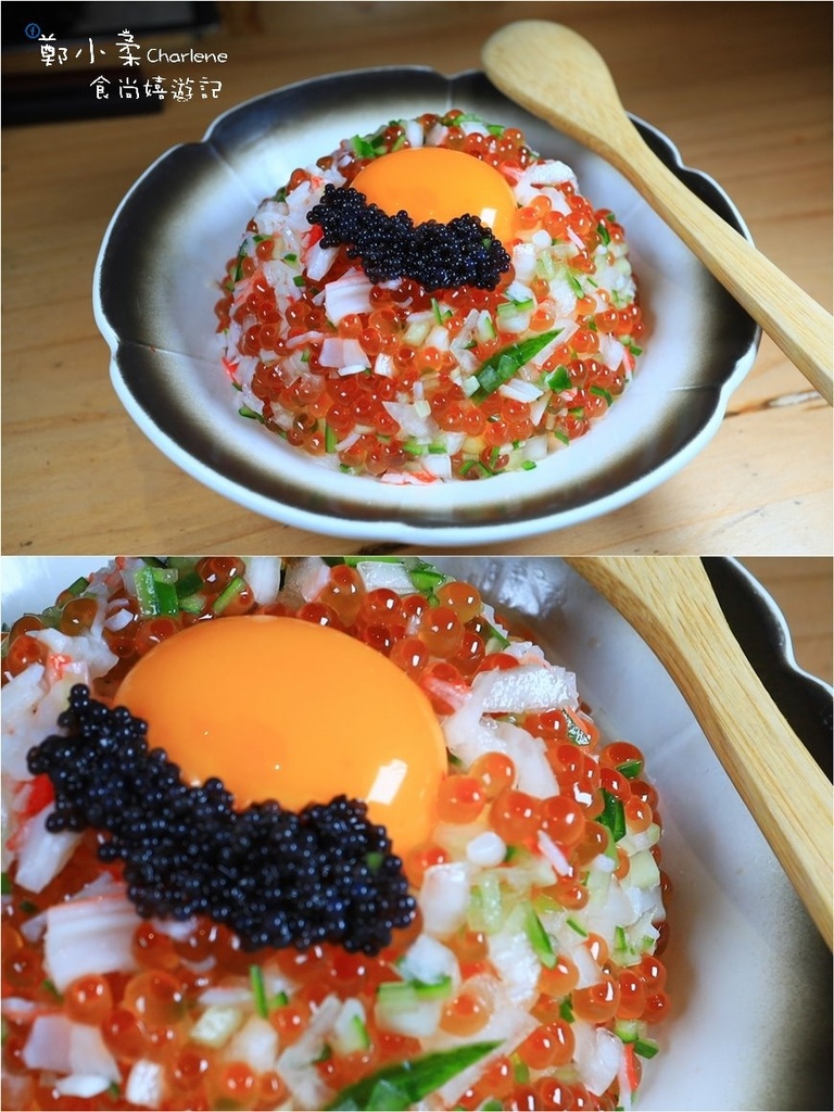 滿滿橘紅剔透的鮭魚卵,搭配小黃瓜、壽司米、新鮮蛋黃,