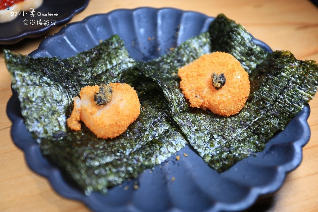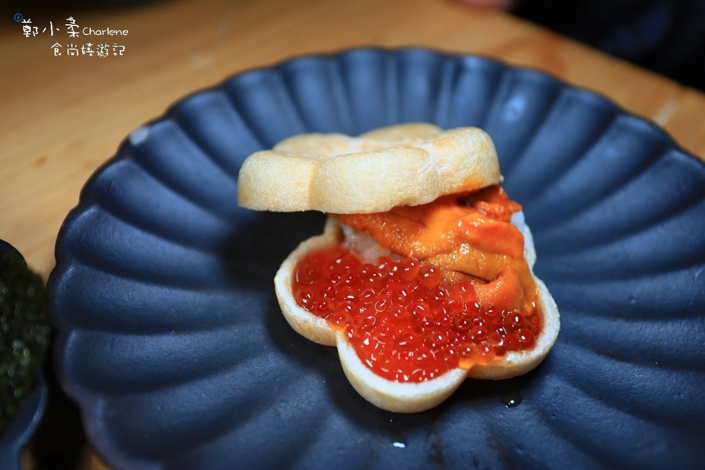 濃郁鮮美,搭配壽司米以及鮮橘色的鮭魚卵和鬆脆外餅,