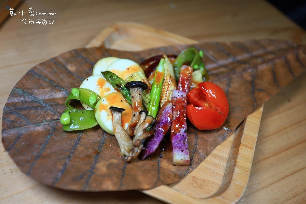 擺盤裝飾很特別的烤蔬菜,五顏六色的,有番茄、菇類、
