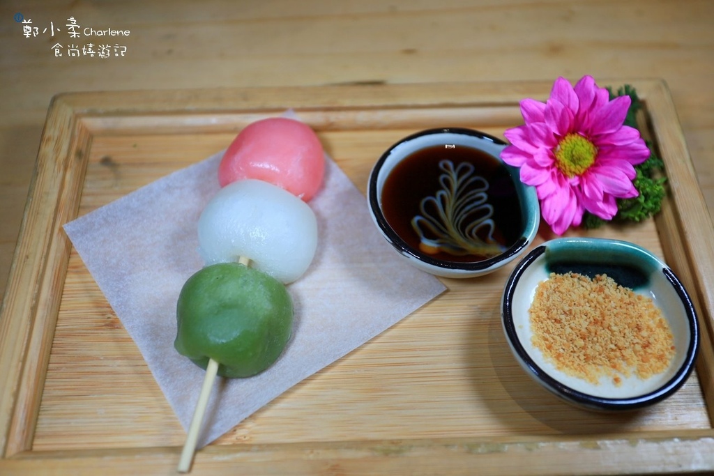 糰子是日式點心-和菓子的一種,粉色代表櫻花,白色是原味的雪,