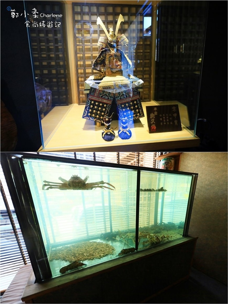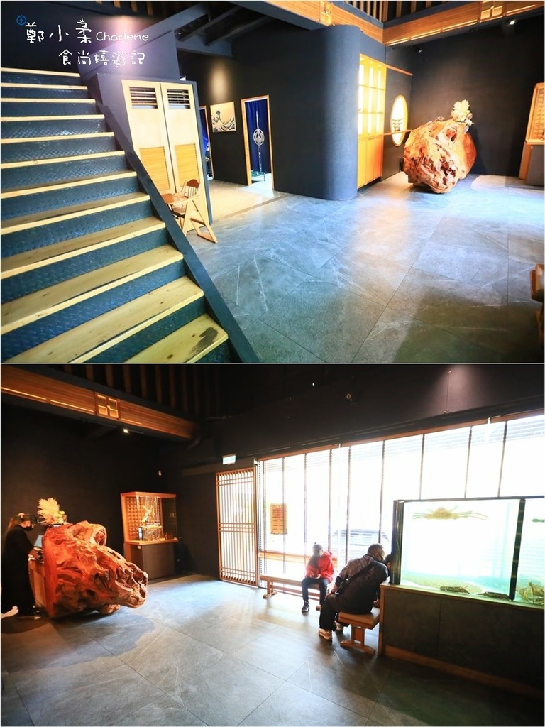 一樓迎賓接待區,有日式大型擺件、大型水族箱裏面,